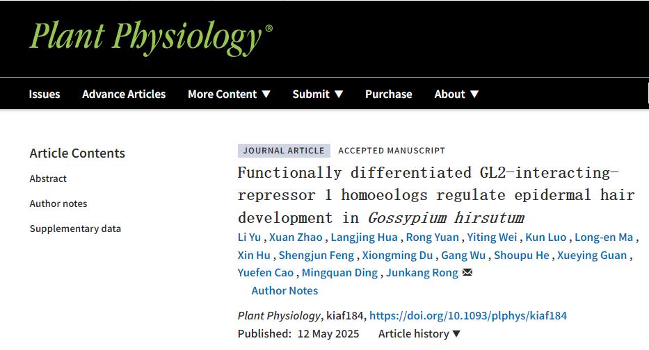 近日,必赢线路检测中心戎均康教授团队在国际知名期刊Plant Physiology(5年IF=7.6)在线发表了“Functionally differentiated GL2-interacting-repressor 1 homoeologs regulate epidermal hair development of Gossypium hirsutum”的科研论文,在棉花表皮毛发育调控机制研究方面取得重要进展。团队研究发现了茎杆表皮毛“开关”基因GhGIR1D,明确了陆地棉A亚组与D亚组GhGIR1基因在调控茎杆茸毛和棉花种子短绒的功能分化。前期研...